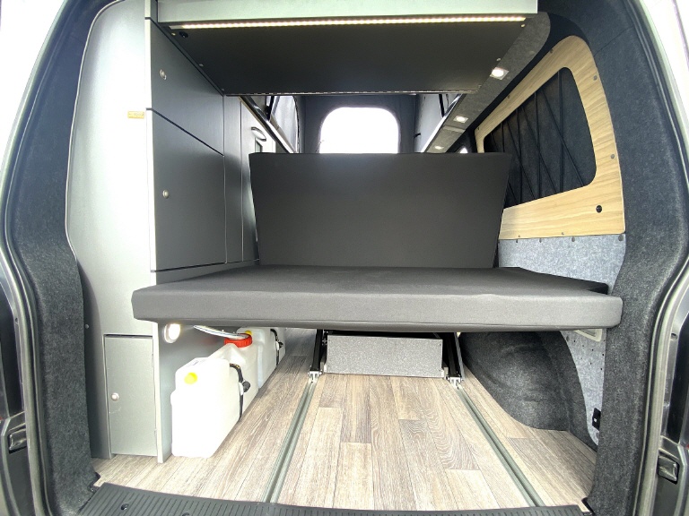 LADERAUM - unter dem Heckteil des Bettes bleibt viel Platz für Deine Reiseausrüstung. Auf Wunsch montieren wir gerne auch einen Schwerlastauszug für zB.: Euro Boxen