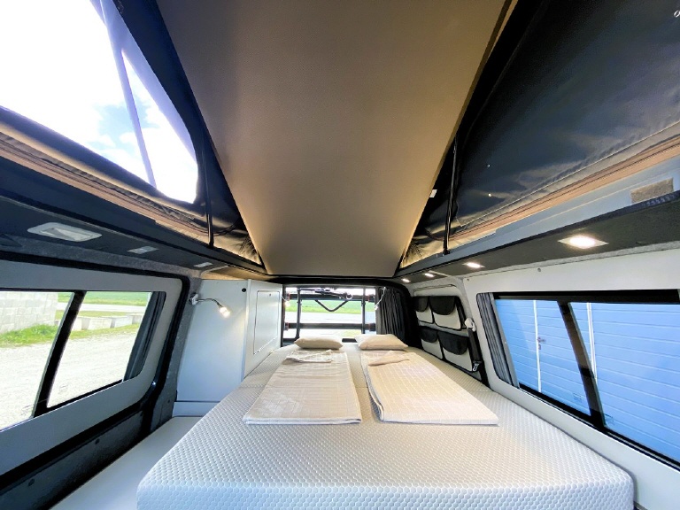REIMO TRIOSTYLE - KUWOVANS BUS.2 Diese Variante ist vergleichbar mit dem VW California Ocean. Eine Möbelzeile mit Küche, Wasseranlage, Gasanlage, 12V und 230V Module, variable Schlafsitzbank mit 3 Sitzplätzen und 2 Schlafplätzen und ein Schlafdach - hier das Reimo EasyFit vorne hoch Zeltbalg standard -