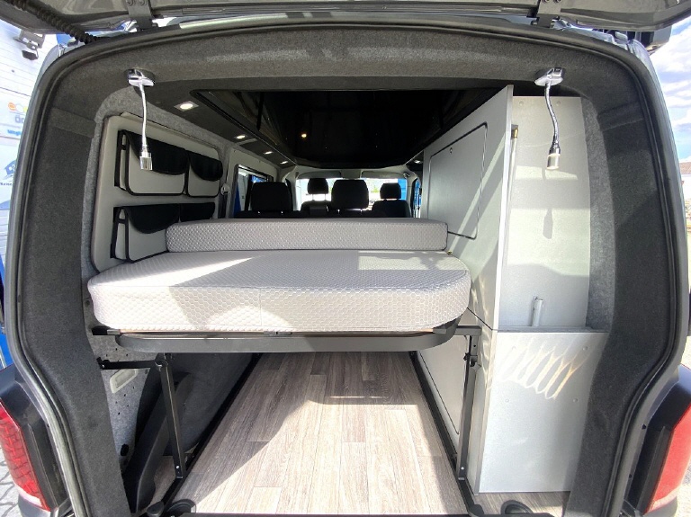 REIMO - BIKE & SURF - KUWOVANS BUS.1- Basisfahrzeug ist der VW T5/T6/T6.1 mit kurzem Radstand. die 2er Sitzbank in der 2. Rihe kann erhalten ( oder nachgerüstet) werden. Das Bike n´Surf Bett mit ausziehbarem Lattenrost (198 x 130cm) kann in der Höhe angepasst werden. -