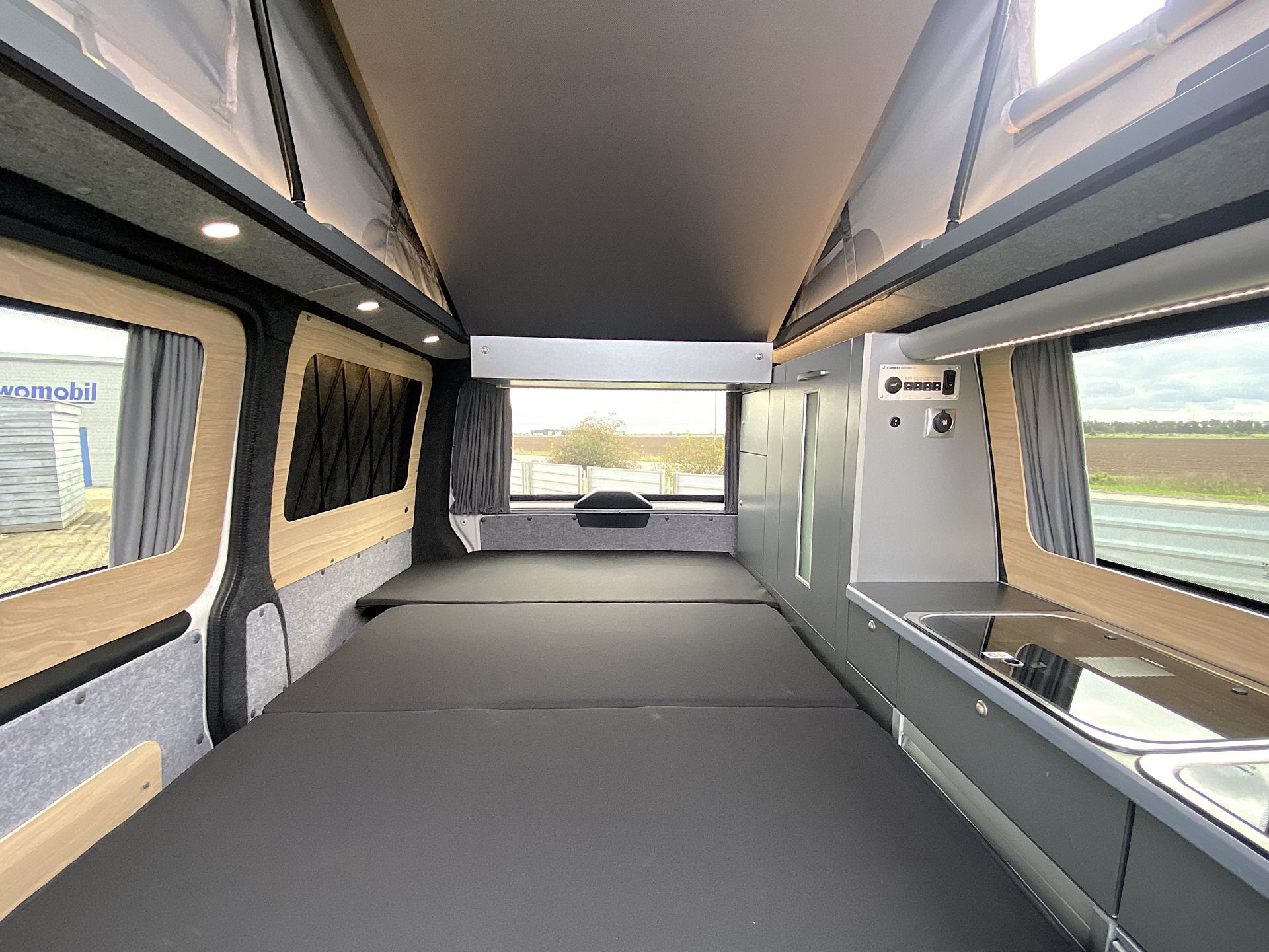 Das Raumkonzept - die wesentlichen Elemente sind aus dieser Perspektive sehr gut ersichtlich. Bank - Bett - Seitenschrank - Küchenbox "Cooky" - Taschenelement für die Aufbewahrung - und natürlich das tolle Reimo Schlafdach - geht aber auch ohne! -