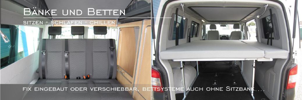 Ganz neu sind die Campingboxen / Moduleinsätze für das Fahrzeugheck. Sie können je nach Modell auch ein Bett ermöglichen, und alles ist wieder ausbaubar! Auch für ältere Fahrzeuge sind Sitzbänke - dann aber meistens ohne Zulassung zur Benutzung während der Fahrt - erhältlich.
