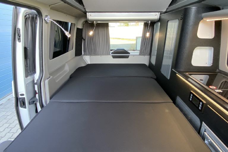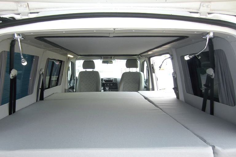 Du kannst aber auch falls vorhanden die Originalsitze im Bus lassen ( zumindest teilweise) und durch die Umklappfunktion ein bequemes Bett darüber platzieren. Wie mit dem Bike n`Surf Konzept.