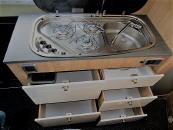 Hier sehen Sie die einfache schematische Darstellung der Wohnbereiche für dieses Fahrzeug. Im vorderen Bereich finden Sie die Sitzgruppe welche durch die drehbaren Fahrerhaussitze für bis zu 4 Personen geeignet ist. Im Mittelbereich ist die Küche beifahrerseitug angebracht, gegenüber ist die Nasszelle welche auch ein Kasetten WC, ein Waschbecken und eine Duschmöglichkeit bietet. Im Fahrzeugheck finden Sie das große Doppelbett mit Einzelunterfederung. Darunter befindet sich ein schöner Gepäckstauraum.