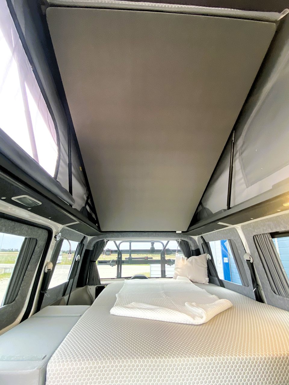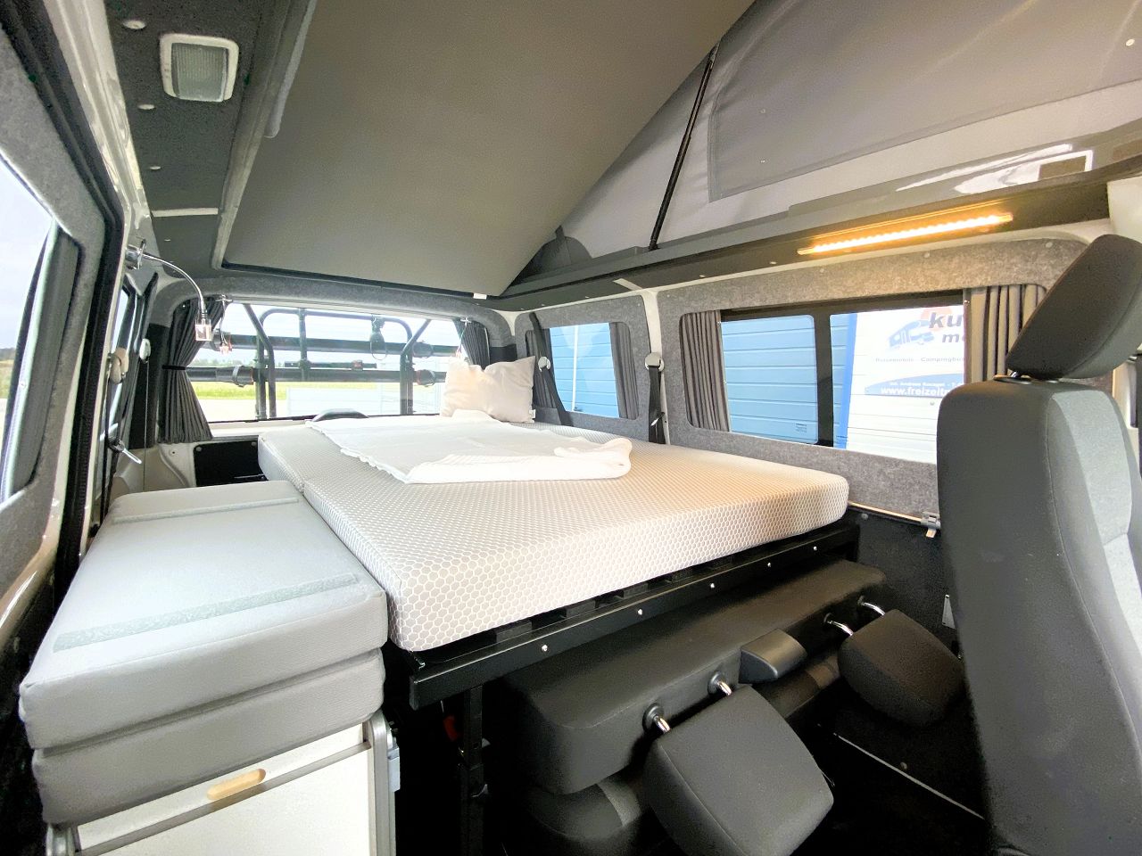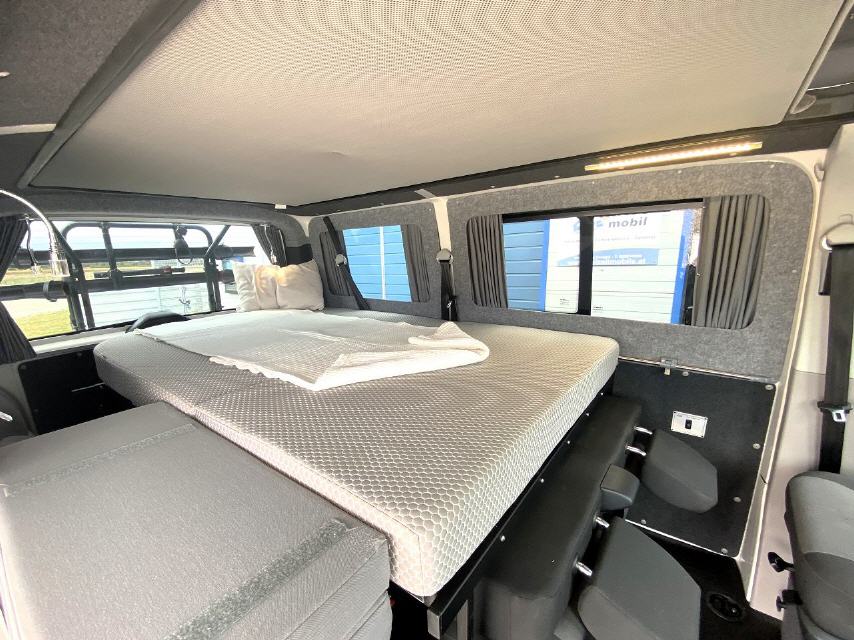 Es erwartet Dich ein Bett mit bis zu 200x118cm unten, Schlafdach mit Bett (200x115), eine Sitzgruppe für 4 Personen und ein kleines Küchenmodul mit Kompressorkühlbox und Gaskocher. TOP Isolierung, 12V Anlage mit LED Lichtern und Steckdosen sind an Bord! Und natürlich das tolle Reimo EasyFit Schlafdach - Aufstelldach mit Bettfunktion vom Feinsten! Standheizung, Schiebefenster, Vorhanganlage - es darf so richtig gemütlich werden!