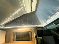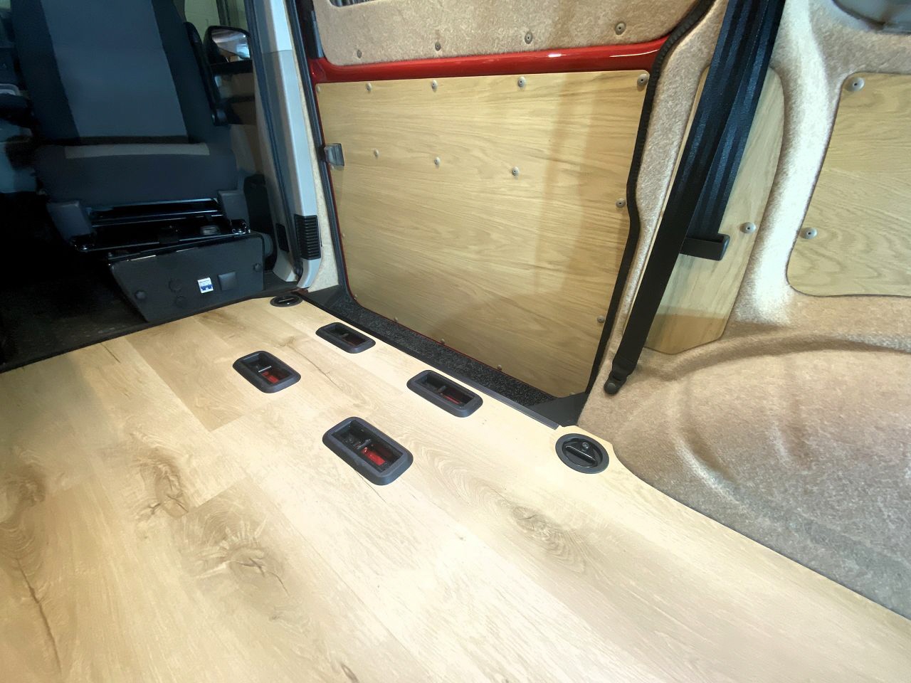 Schalldämmung ALU Butyl flächig bis Fensterlinie, Thermische Isolierung mit xtrem-Isolator 10 - 20mm bis Fensterlinie, Verkleidung sichtbarer Blechflächen & Holme mit 3mm Autofilz mittelgrau, Fensterpanele gefilzt, Seitenpanele in Echtholz Eichendekor