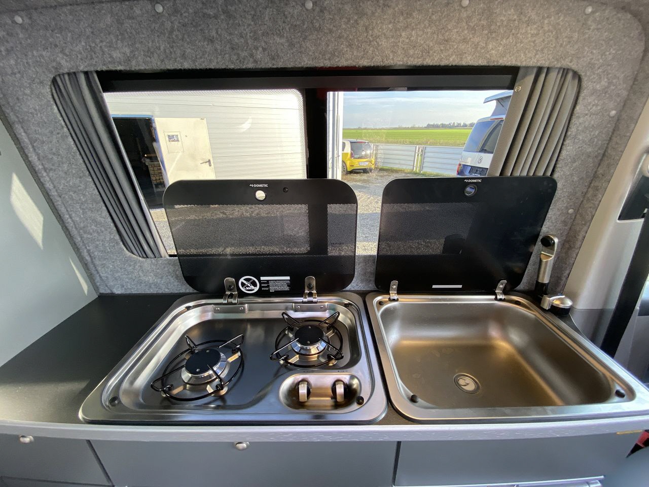 2-flamm Gaskocher, Edelstahlspüle, Wasserhahn via Tauchpunpe, Kaltwasserversorgung, Kompressorkühlschrank Dometic 45L, Laden, Rollladenschrank, Staufach