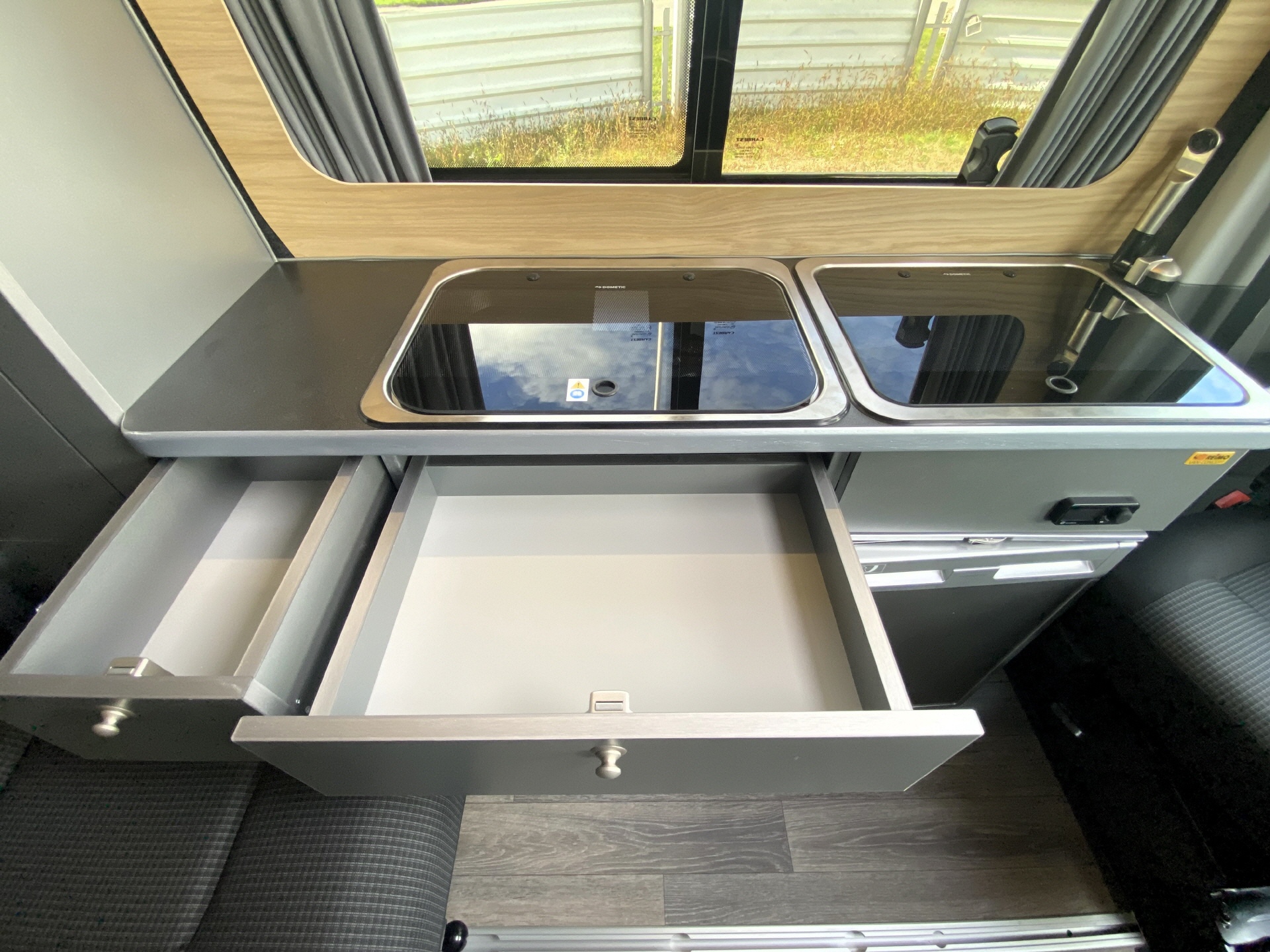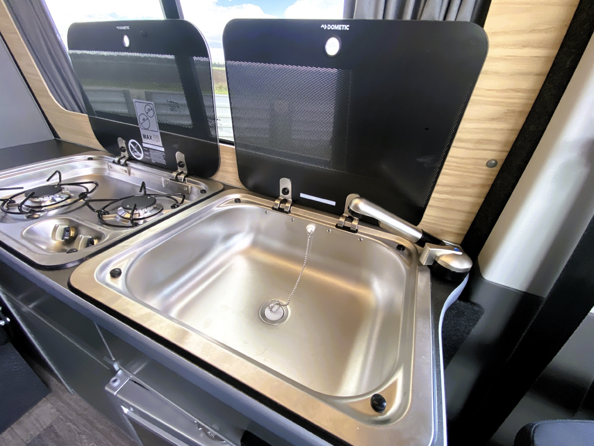 2-flamm Gaskocher, Edelstahlspüle, Kaltwasserversorgung, Abwassertank, Kompressorkühlschrank Dometic 45L