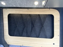 Schalldämmung ALU Butyl flächig bis Fensterlinie, Thermische Isolierung mit xtrem-Isolator 10 - 20mm bis Fensterlinie, Verkleidung sichtbarer Blechflächen & Holme mit 3mm Autofilz mittelgrau, Fensterpanele in Echtholz Furnier Eiche hell, Seitenpanele in Echtholz Dekor Eiche hell bzw in Autofilz