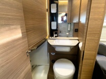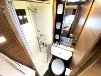 Xpand Bad mit Dusche, klappbaren Duschwänden, verschiebbares Waschbecken, THETFFORD Toilette mit Kassette 19L drehbar, Dachluke 28x28cm für gute Belüftung.